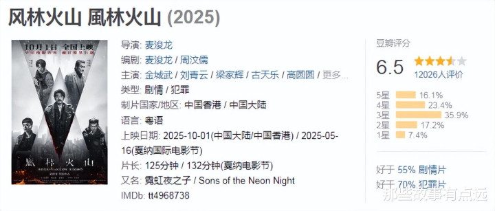 由一群香港老戏骨主演的电影《风林火山》,在国庆档上映之后,网络评分达到了6.5分。
