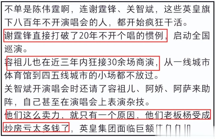 从这些发言就能看出来,陈伟霆对老板很感激。此外还有网友爆料,陈伟霆“一把年纪”之所以还频频来内地演偶像剧,就是为了拼命打工还债。且不仅仅是他,就连谢霆锋卖命开巡回演唱,容祖儿、阿娇、关智斌等人疯狂工作,全都是为了解决英皇的债务危机。