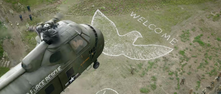 影片前半段,美方谈判代表争位次,扔纸鸽子,直升机降落时故意降落在志愿军铺的和平鸽上,总之永远在挑衅。