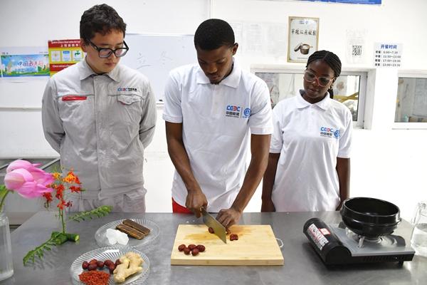 安哥拉员工乔治饶有兴致地拿起生姜、红枣、红糖等材料,仔细端详,感慨道:“用生姜来制作茶饮,胃里暖暖的,真是既新奇又有趣。”