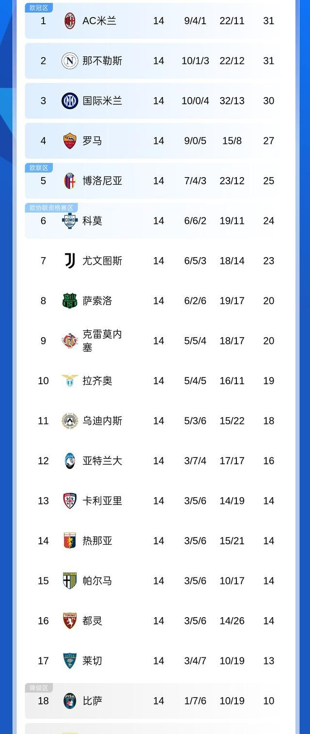 所以你看,这一轮踢完,整个局面就乱了套。米兰和那不勒斯都是31分,米兰多赢了几个球,排在最上面。国米呢?就差一分,30分在第三。